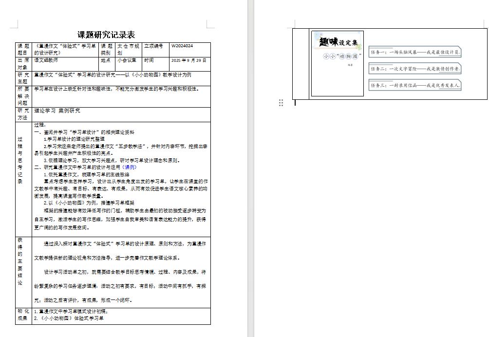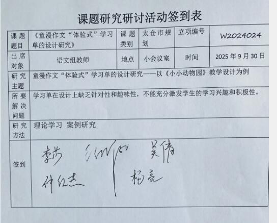 2025年9月30日,太仓市规划课题《童漫作文“体验式”学习单的设计研究》团队与语文组教师,在小会议室开展《小小动物园》学习单设计研讨。依托童漫作文,梳理学习单的主线脉络,重点考虑学生怎样学习,设计出从学生角度出发的学习单,让学生在课堂的作文教学中有兴趣、有目标、有表达、有成果,从而有效促进学生语文核心素养的均衡发展,提高课堂写作教学质量。 学习单让学生从传统的教育模式中解放出来,让学生在活动中获取知识,在轻松愉悦的学习氛围中提高学习效率。
