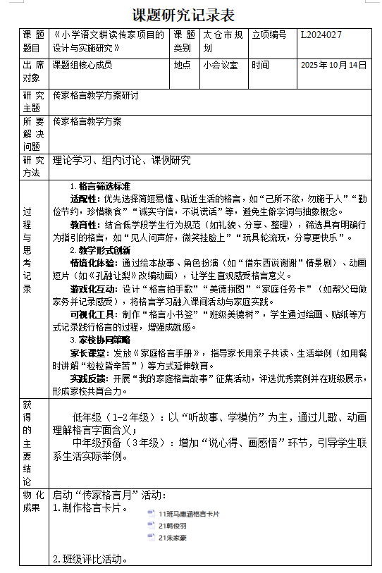 实践反馈:开展“我的家庭格言故事”征集活动,评选优秀案例并在班级展示,形成家校共育合力。